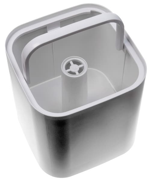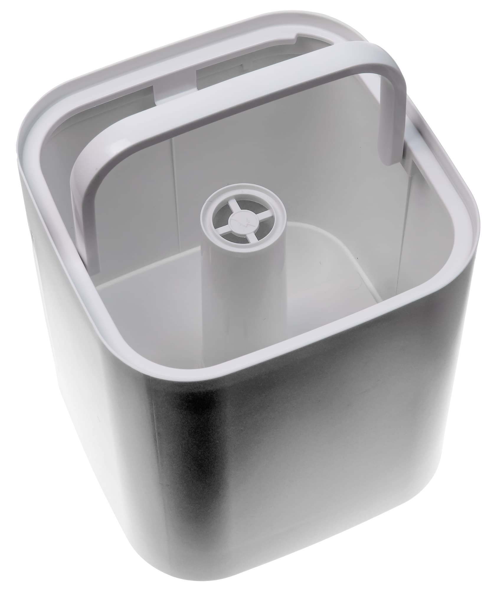 Резервуар для воды занимает основной объем корпуса. Сквозь него проходит шахта для выхода пара. Внутри также есть складывающаяся ручка: воду в устройство можно заливать через верхнюю крышку, а можно просто снять бак, наполнить его из-под крана и отнести к месту установки увлажнителя, держа, как ведро, за ручку.