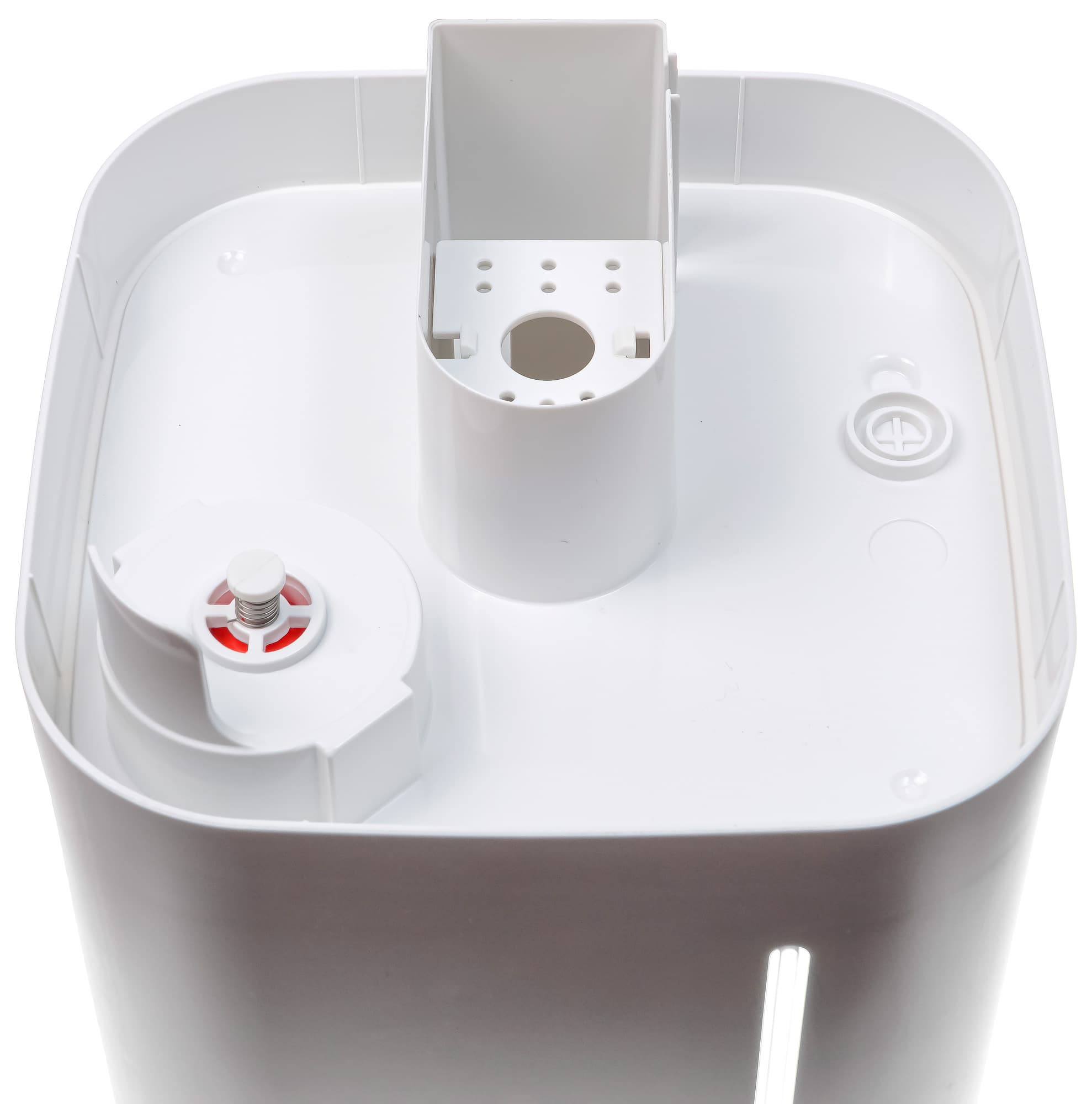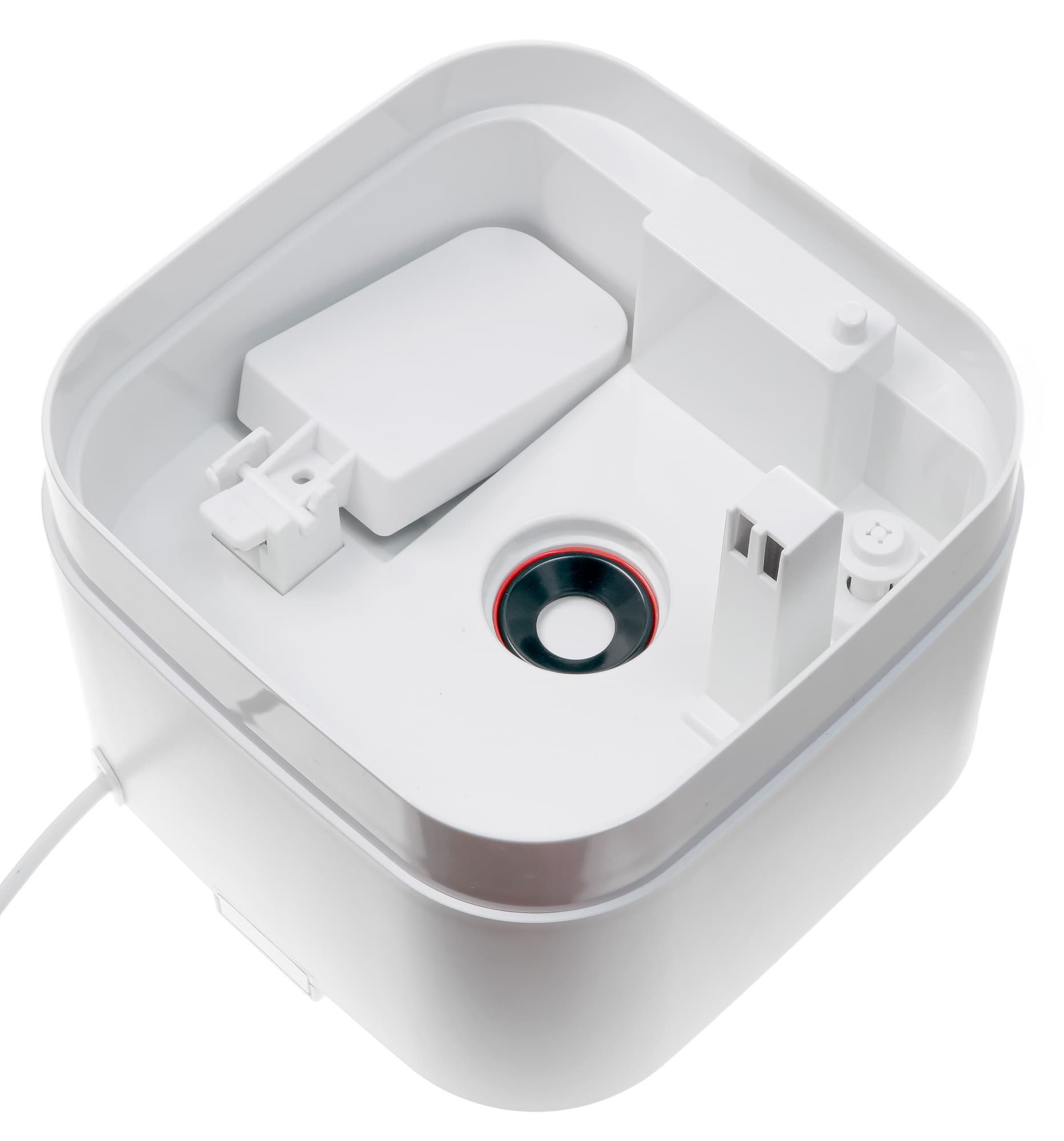 Верхняя часть основания представляет собой емкость для воды, в центре которой находится главный рабочий орган увлажнителя — пьезокерамический ультразвуковой излучатель, генерирующий пар. Рядом с ним располагаются поплавковый датчик уровня воды с герконовым выключателем, сопло выхода воздуха, подаваемого снизу вентилятором, и ответная часть клапана, регулирующего подачу воды из бака.