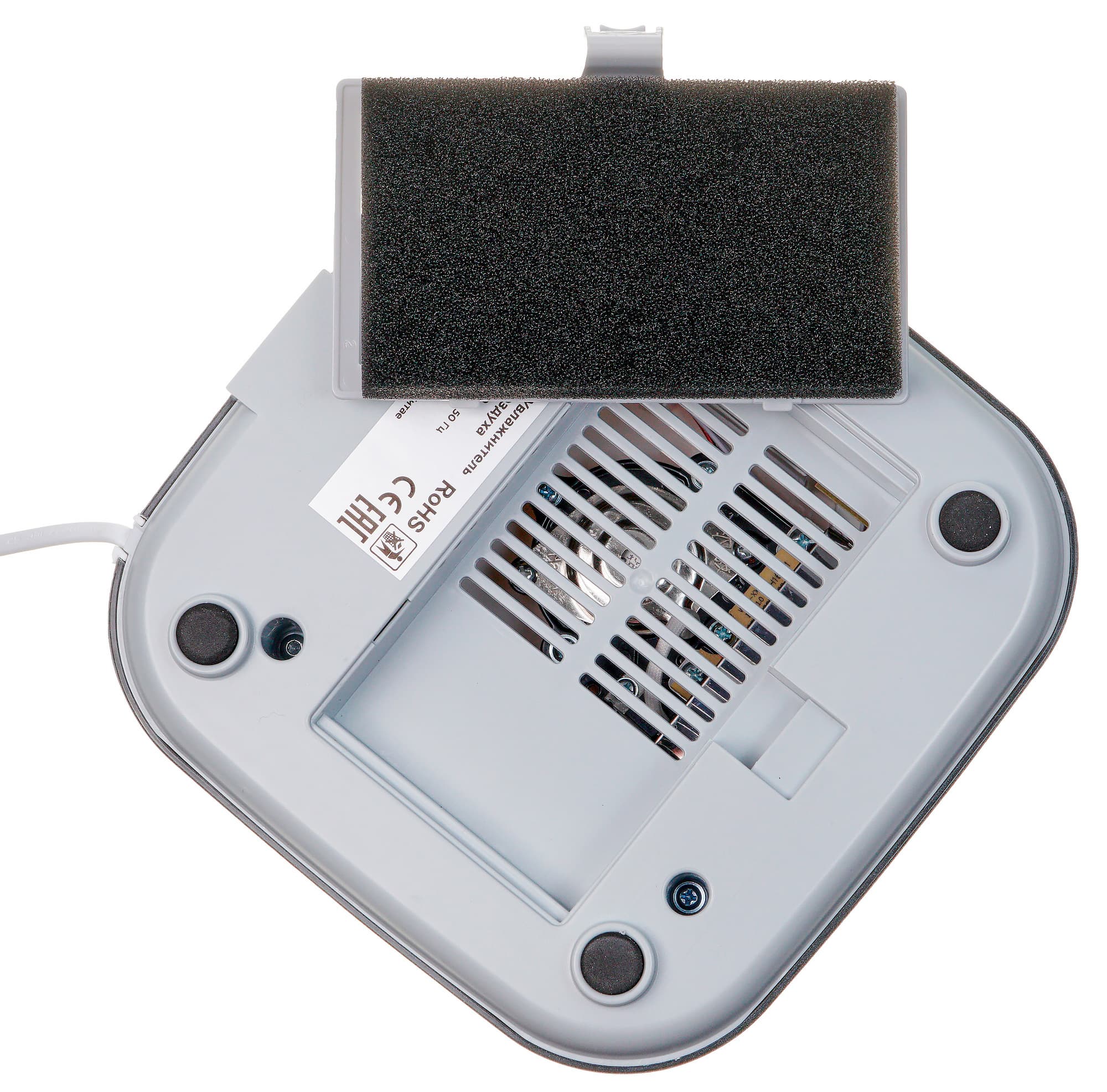 Устройство опирается на четыре прорезиненные ножки. В центральной части дна располагается съемная решетка воздухозаборника.