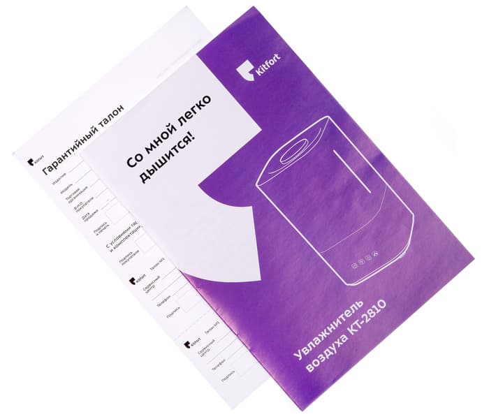Обычное для Kitfort оформление руководства по эксплуатации — белая глянцевая бумага, фиолетовый дополнительный цвет, слоган модели на обложке — мы увидели и в случае Kitfort KT-2810.