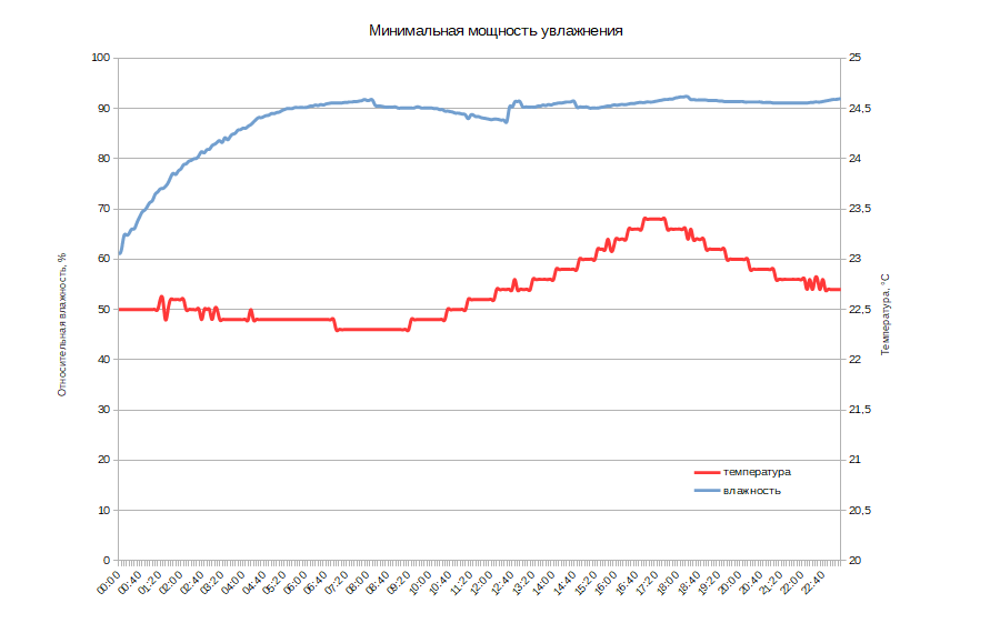 Как и в предыдущих тестах, увлажнитель быстро и уверенно поднял влажность в помещении за отметку в 90%, но на этот раз удерживал ее практически без изменений.