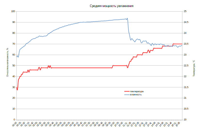 За время теста относительная влажность в помещении увеличилась с 62% до 80% за два с небольшим часа, заметно превысив к концу периода 90%. Температура воздуха незначительно снизилась.