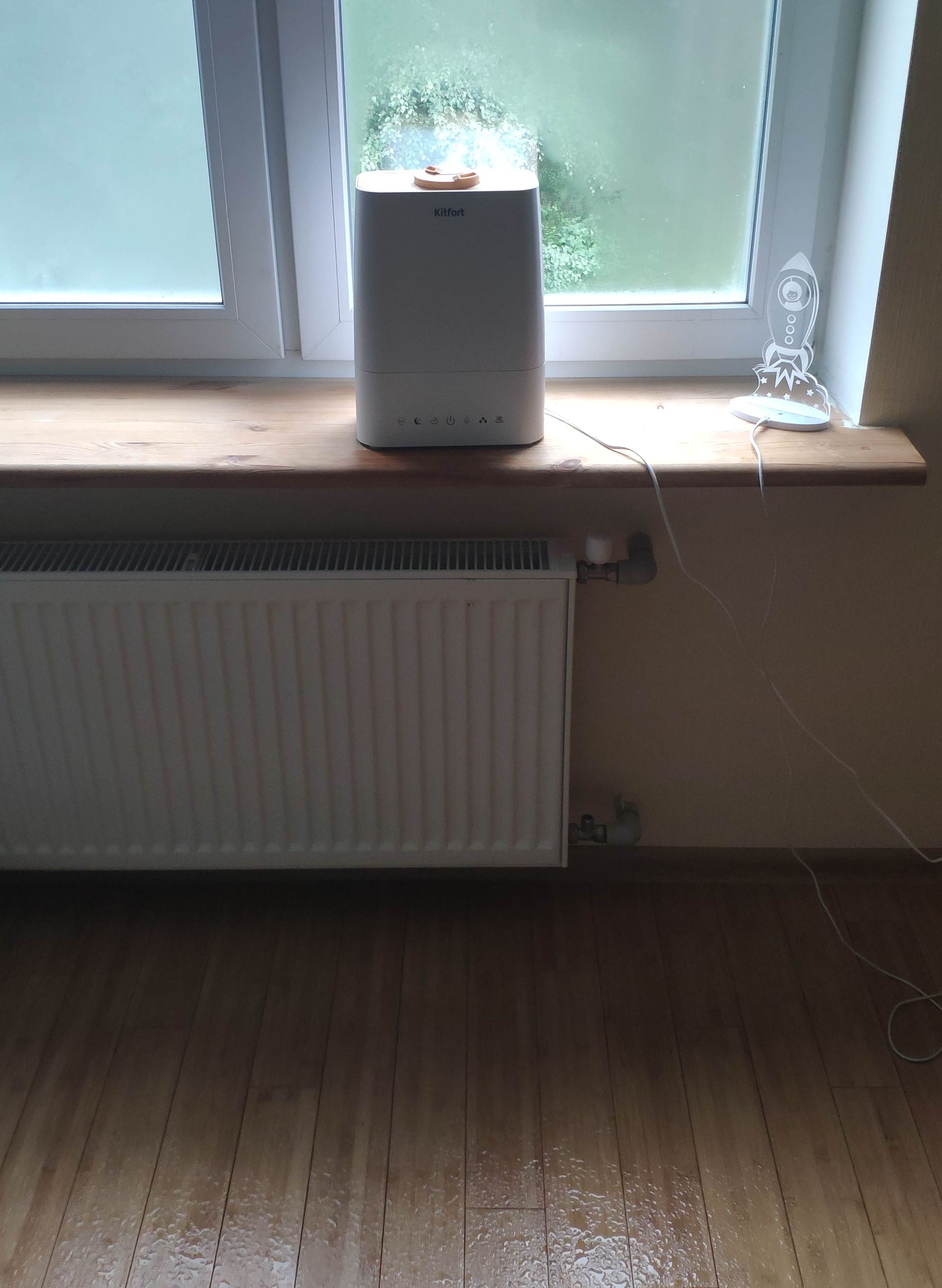 Технический запах после распаковки отсутствовал начисто. Перед началом работы мы сполоснули резервуар и протерли корпус чуть влажной тканью. Добавление ножек вниз корпуса прибора остается на усмотрение покупателя, но позволяет приподнять увлажнитель чуть выше над полом или другой поверхностью. Мы и так ни разу не наблюдали осадка мелких капель в процессе тестирования (исключая внештатную ситуацию с зашкаливающей влажностью из-за забытого таймера), но Kitfort советует размещать прибор на расстоянии 50—100 см от пола, чтобы равномерно увлажнить воздух в помещении. Это может быть журнальный столик или широкий подоконник (мы выбрали второе), а также провели тест с теплым паром на максимальном режиме в положении на полу. KT-2811 прошел его успешно — спустя час работы никакого конденсата на паркете не наблюдалось.