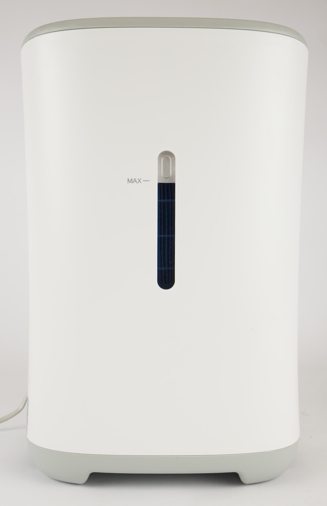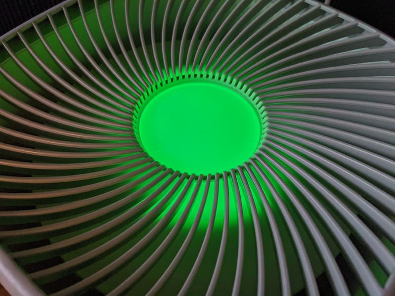 Лампа подсветки, скрытая за полупрозрачной крышкой под решеткой вентилятора, меняет цвет в зависимости от текущей влажности в помещении: при высокой, свыше 60%, относительной влажности она горит зеленым, когда показания гигрометра находятся в диапазоне от 30% до 60% RH — синим, а при снижении влажности до 30% и меньше — красным. Когда вода в баке заканчивается, красный начинает мигать.