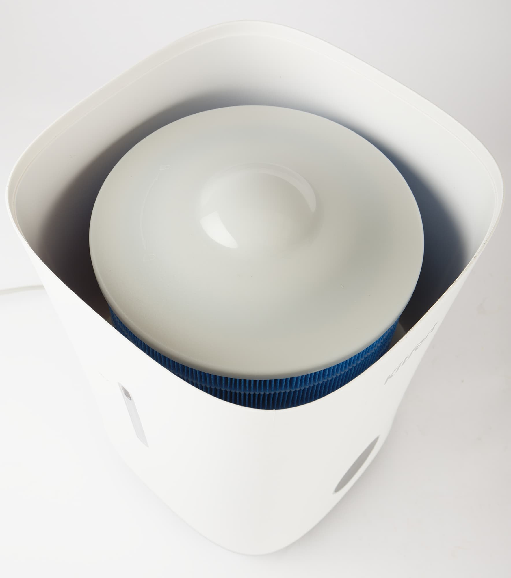 Под крышкой располагается рабочая емкость с увлажняющим фильтром цилиндрической формы. Фактура его стенок напоминает традиционные HEPA, но о классе фильтрации материала, использованного в приборе, производитель умалчивает.