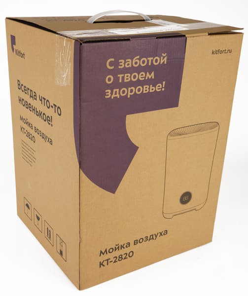 Прибор поставляется в картонной коробке c привычным для потребителя техники Kitfort дизайном: коричневый картон, схематическое изображение устройства и непременный слоган на лицевой стороне — свой для каждого класса бытовой техники производителя. Для климатического оборудования это безыскусный лозунг «С заботой о твоем здоровье!»