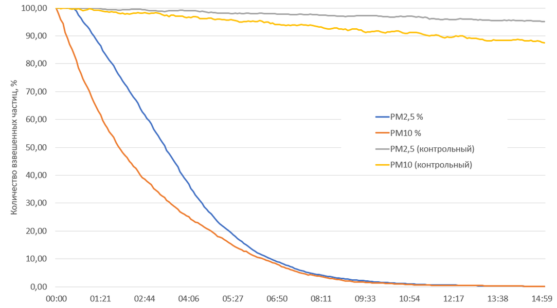 | Снижение загрязнения частицами PM10 на 50% от максимума, минут:секунд | 1:55 |