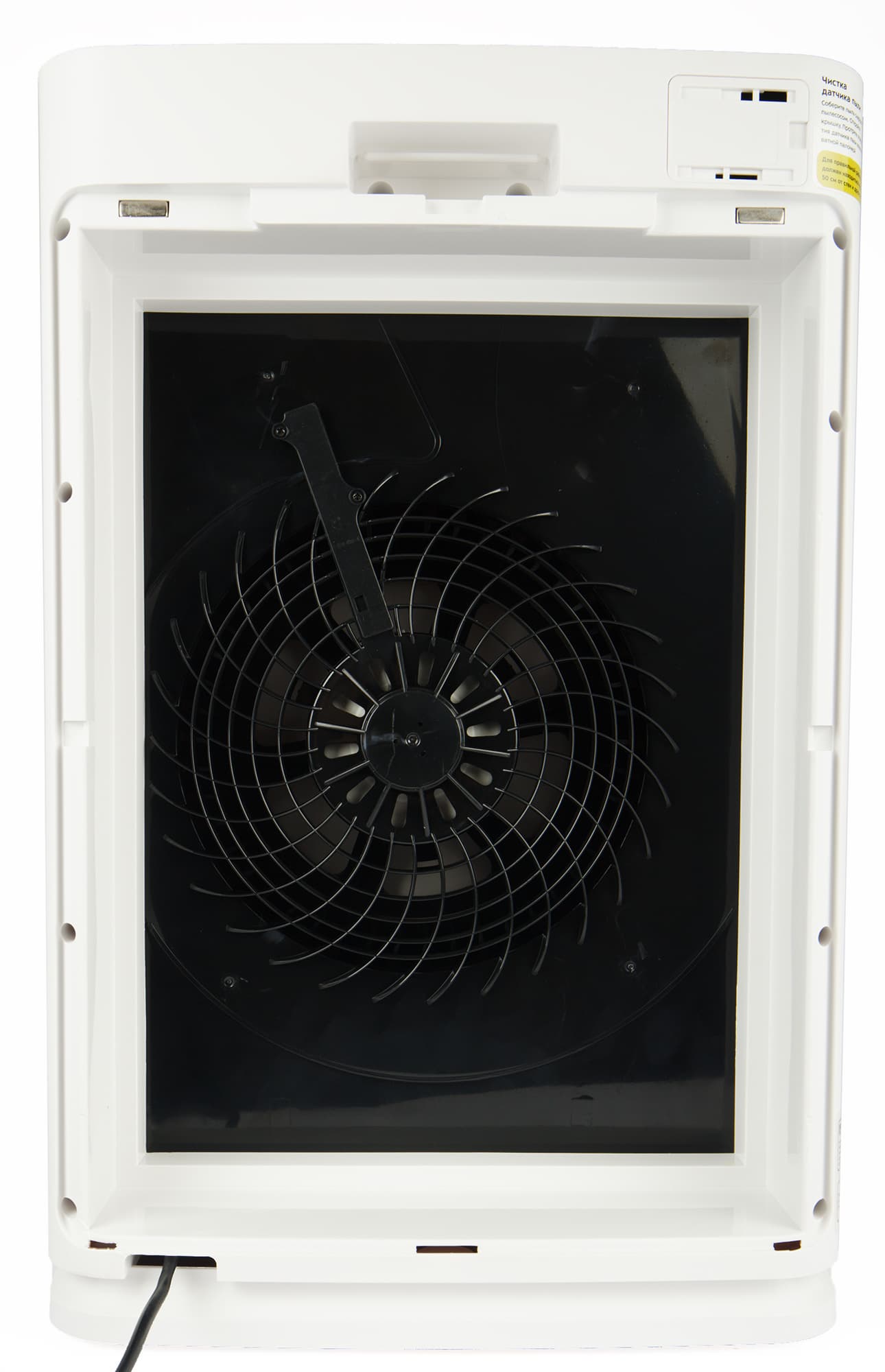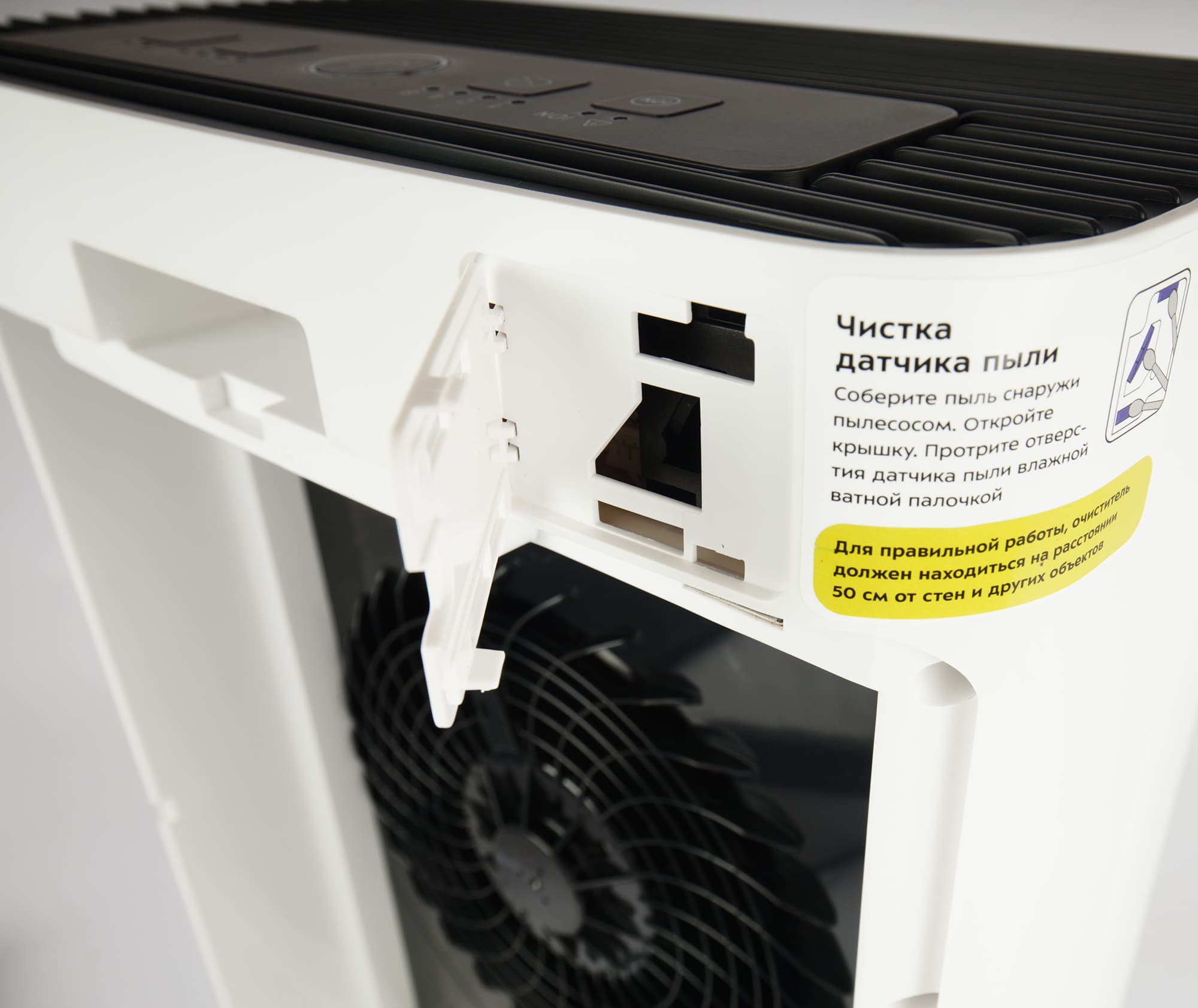 За угольным фильтром стоит вентилятор. Над крышкой его отсека есть дверца датчика чистоты воздуха с окошком. Рядом с ней — наклейка-инструкция по очистке датчика.