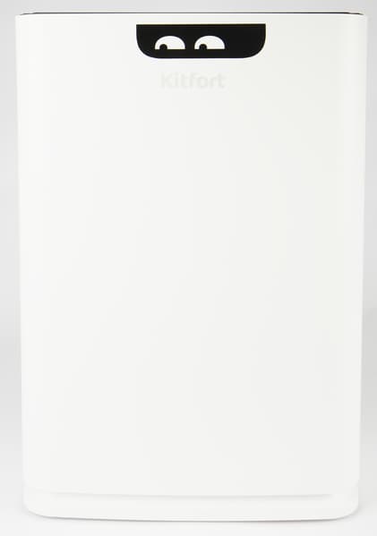 Очиститель воздуха Kitfort KT-2824 — белый пластиковый параллелепипед со скругленными углами. Передняя панель устройства гладкая, ее украшает только светло-серый логотип. Маркетологам компании такой строгий дизайн показалось недостаточно душевным, и они решили дополнительно оживить его с помощью наклейки с «глазами». Кому-то она покажется забавной, а кто-то решит удалить ее сразу после распаковки: на этот случай изготовитель отдельно предупреждает, что наклейка легко снимается, не оставляя следов.