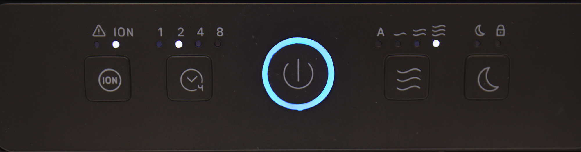 В очиститель установлен датчик, который определяет срок службы HEPA-фильтра — это, по документации, 1500 часов непрерывной работы (на 3-й скорости при среднем уровне загрязненности). По истечении срока загорается индикатор необходимости замены фильтра. Рекомендуется сразу же заменить блок, а затем обнулить межсервисный интервал длинным нажатием на кнопку Ion.