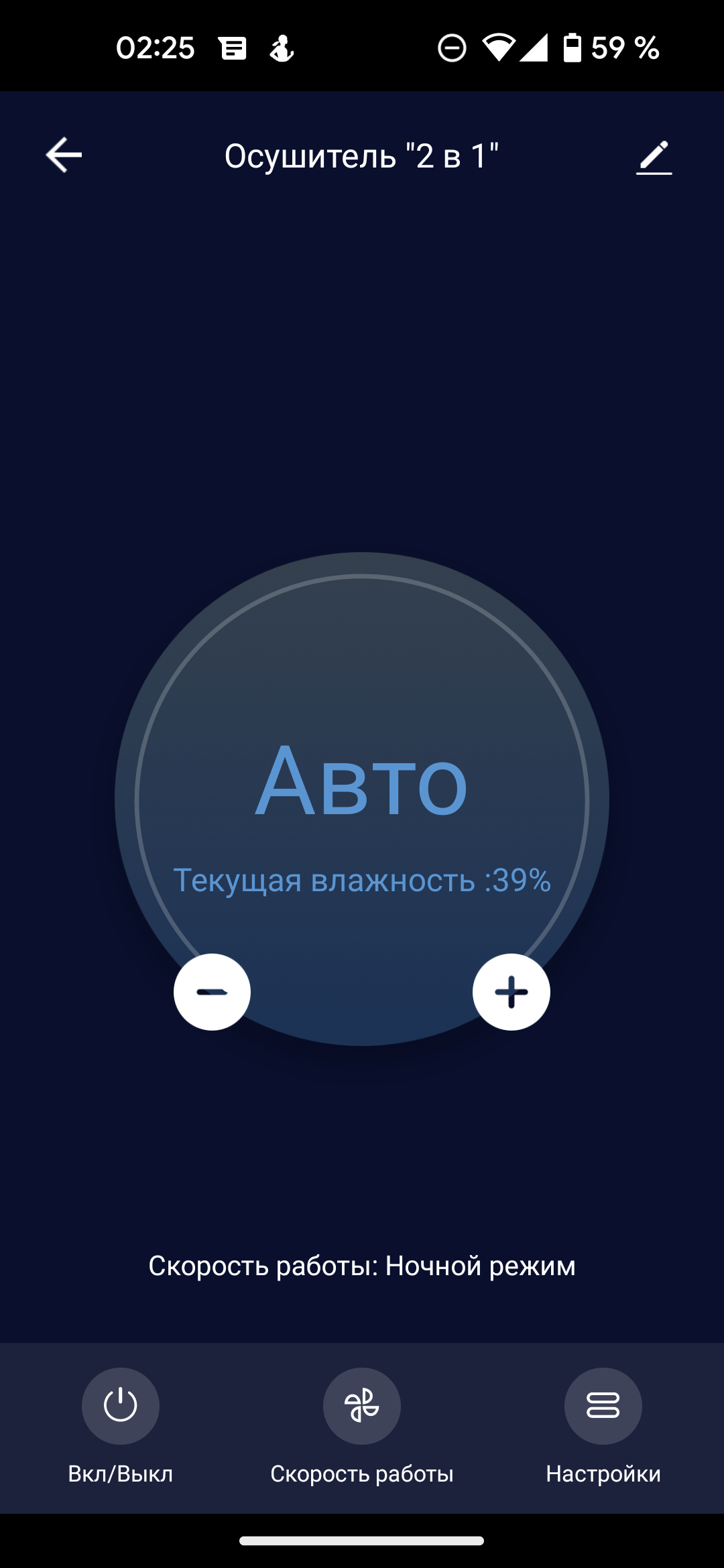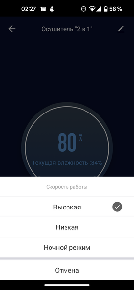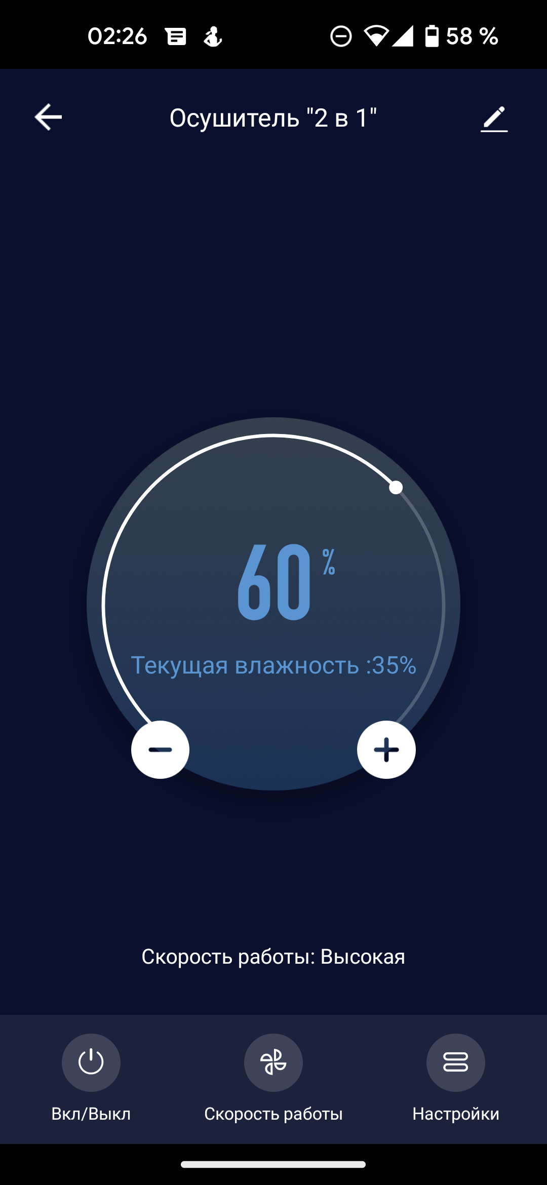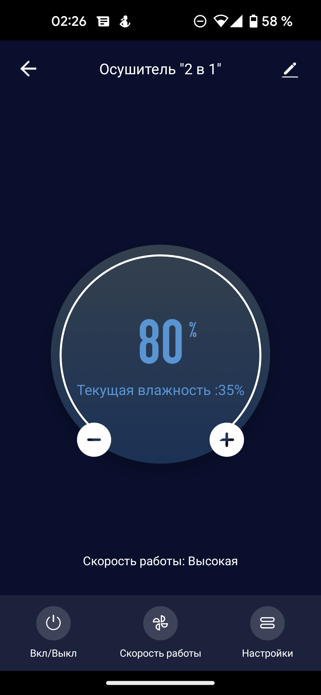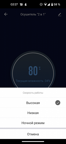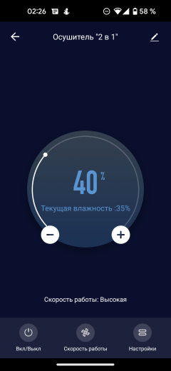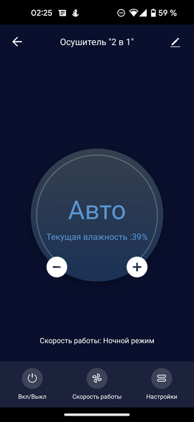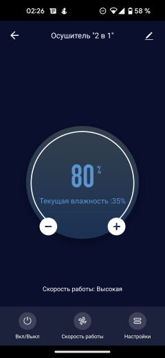 Приложение не слишком расширяет функциональность устройства по сравнению с ручным управлением: здесь продублированы все функции и настройки, доступные с панели на корпусе. Однако с его помощью можно управлять осушителем из любого места, где есть доступ к интернету, — к примеру, заранее включить прибор по дороге домой.