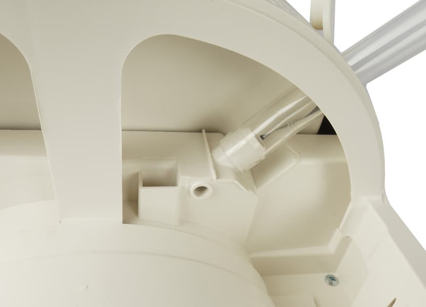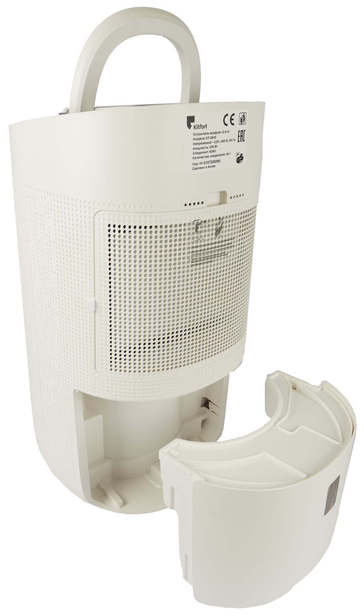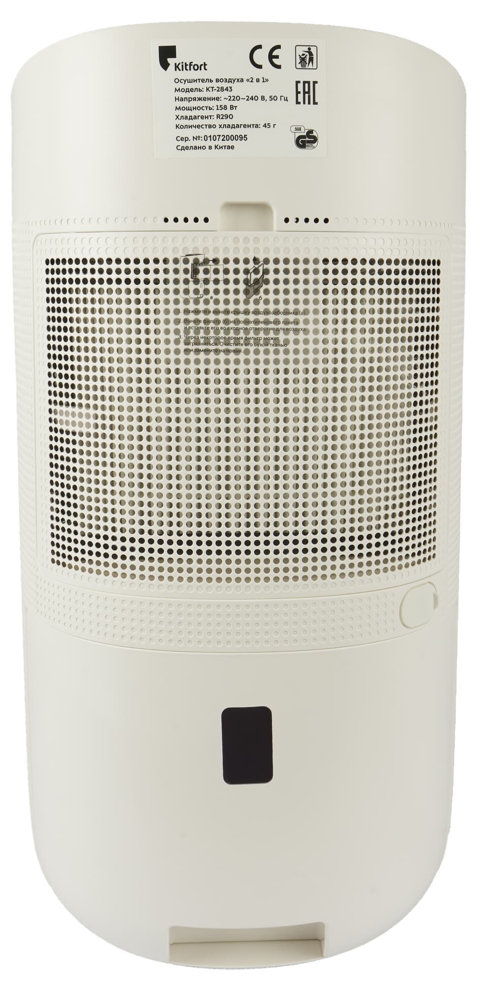 Бак для сбора конденсата емкостью 3,5 литра находится в нижней части корпуса. Образующуюся при работе жидкость Kitfort KT-2843 может сливать во встроенный резервуар либо в любую подходящую тару.