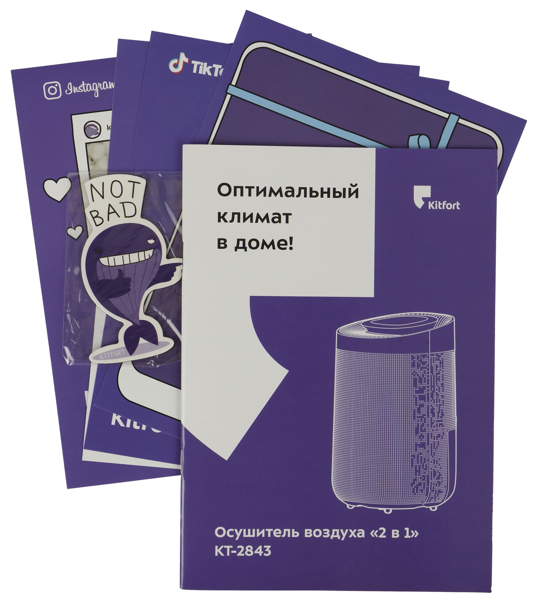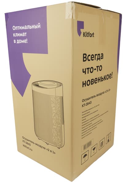 Внутренняя коричнево-фиолетовая упаковка оформлена в фирменном стиле производителя: спереди на ней векторное изображение осушителя, индекс модели, адрес сайта Kitfort и непременный девиз, обещающий в данном случае оптимальный климат в доме.