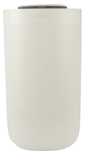 Kitfort KT-2843 представляет собой почти правильный цилиндр белого цвета, украшенный рисунком из множества мелких точек. В верхней части передней стороны еле заметен светло-серый логотип компании-производителя.