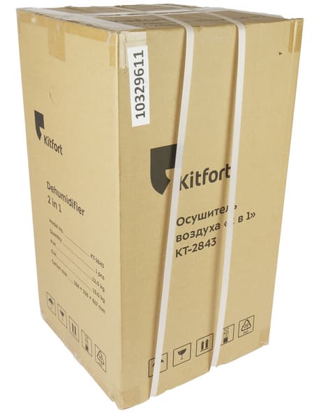 Довольно тяжелый осушитель поставляется в дополнительной картонной коробке, усиленной капроновыми стропами. На ней напечатаны название и модель прибора, краткие технические характеристики и транспортировочная информация.