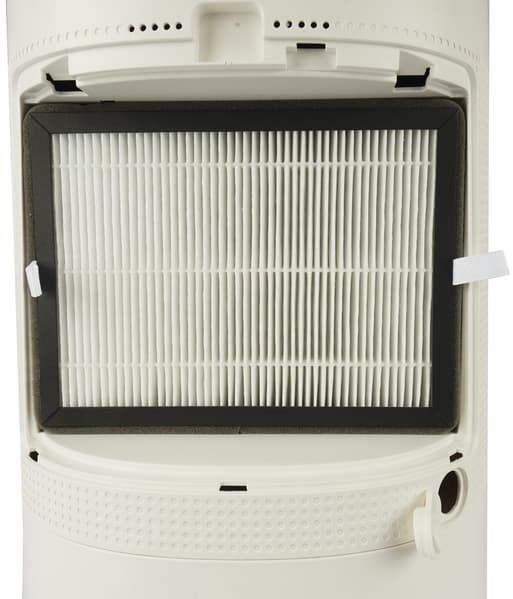 За решеткой прячется квадратный воздушный фильтр, представляющий собой гармошку HEPA-элемента с уплотнителем из мягкого пористого материала и матерчатыми «ушками», облегчающими извлечение.