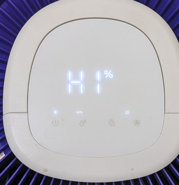 Крупные белые цифры на дисплее отображают значение текущей относительной влажности в помещении в пределах от 30% до 90% Rh. При превышении максимального цифровой дисплей показывает «Hi», а если воздух оказывается суше минимума — «Lo».