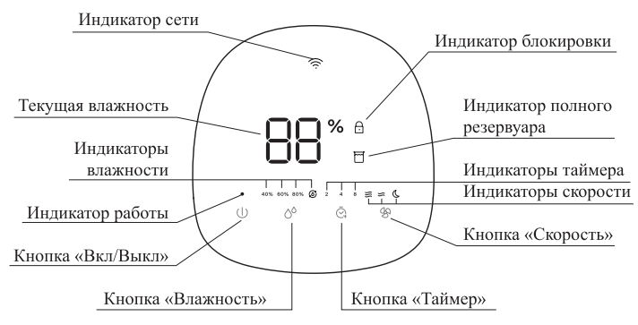 - «Таймером» можно задать продолжительность работы осушителя. Доступны значения 2, 4 или 8 часов. Четвертое нажатие выключает опцию. Длительное нажатие на этот сенсор активирует подключение прибора к сети Wi-Fi.