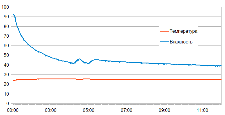 Как следует увлажнив помещение, мы включили осушитель воздуха на максимальной мощности, установив значение целевой влажности на 40%. Динамику изменения влажности можно видеть на графике ниже.