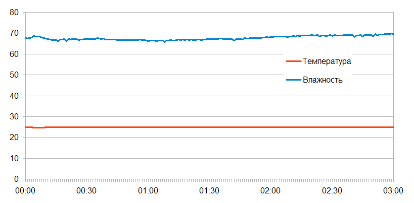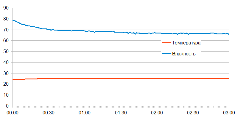 Чтобы оценить производительность устройства на минимальной скорости, мы повторили эксперимент, включив устройство в ночном режиме. Исходная влажность в помещении составляла те же 79%.