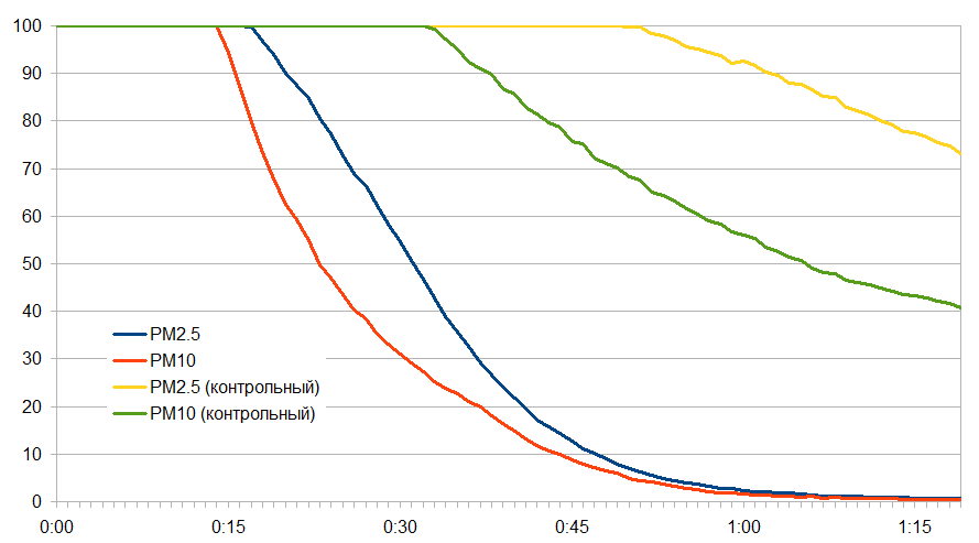 Для сравнения скорости очистки воздуха с помощью прибора и естественным образом мы повторили эксперимент: отключили воздухоочиститель и посмотрели, с какой скоростью частицы осядут, если ничего с ними специально не делать. Полученные данные представляем в виде графика.
