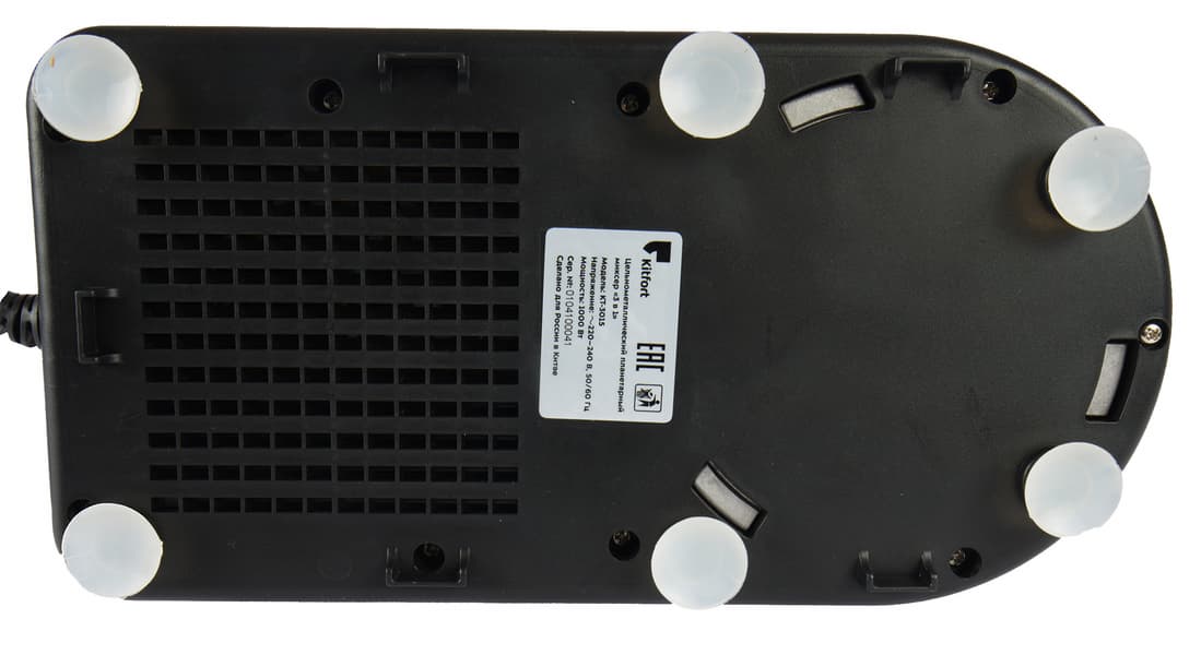 На дне базы мы видим шесть ножек с присосками, диаметром 2,4 см и четыре пластиковых упора. Все это делает основание устойчивым и крепко удерживает прибор на месте, при этом не требуя больших усилий при поднимании миксера или перестановке его с места на место. Также на дне находятся вентиляционные отверстия и наклейка с технической информацией.
