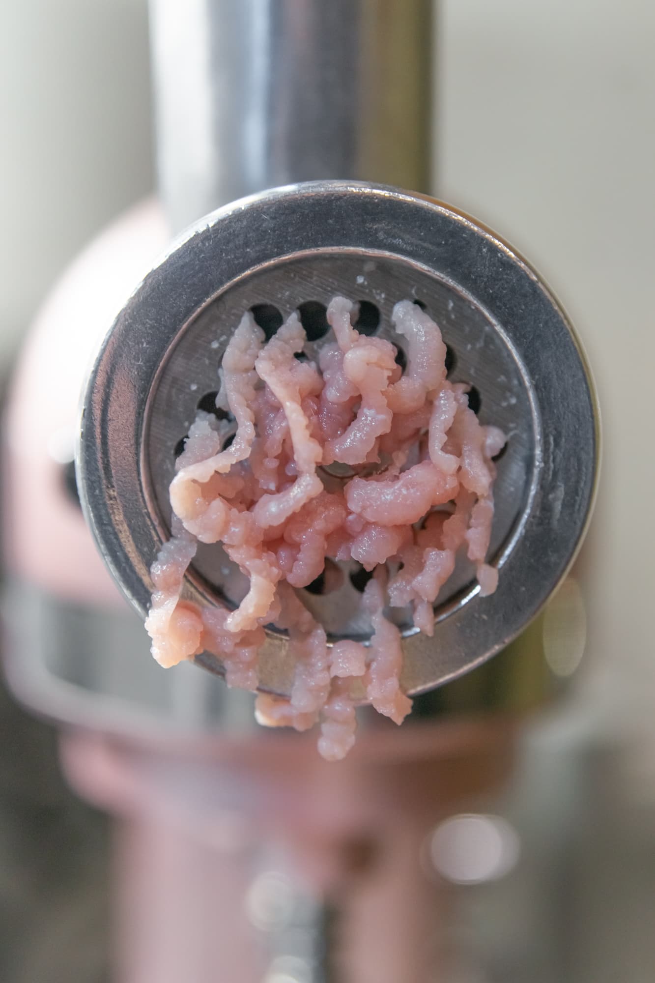Мясо порезали на небольшие кусочки (полоски), свободно проходящие в узкую горловину мясорубки. Работали на 6-й скорости, со средней решеткой (5 мм), совсем не используя толкатель. Мясо было переработано ровно за 1 минуту.