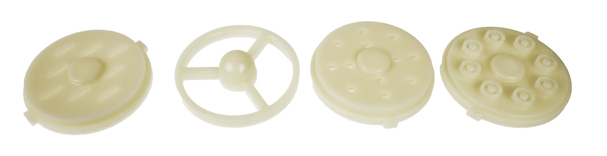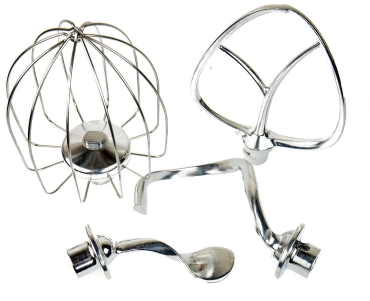 В комплекте к миксеру идут четыре полностью металлические насадки — венчик для взбивания, два крюка для замеса тугого теста (большой и маленький) и насадка для смешивания. Форма насадок традиционна.