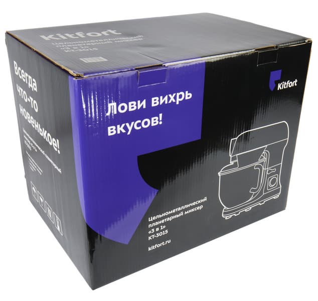 Планетарный миксер Kitfort KT-3015 упакован в большую картонную коробку-параллелепипед оформленную в фирменном стиле компании. На фронтальной стороне коробки черного цвета приведено схематическое изображение прибора, логотип и слоган компании-производителя. На боковых сторонах упаковки содержится информация о технические характеристиках миксера. Ручкой для переноски коробка не оснащена.