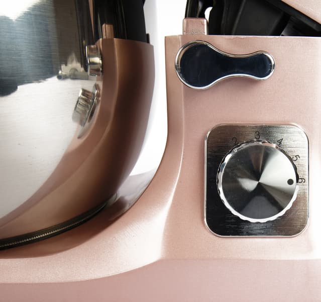 Подготовка к работе выглядит следующим образом. Нажав на кнопку разблокировки и удерживая ее, откидную часть необходимо поднять рукой вверх, затем отпустить кнопку — моторный блок зафиксирован. Теперь можно установить и закрепить в гнезде чашу и надеть насадку на любую ось шпинделя. Если планируется замес густого теста, то задействуются оба шпинделя, так как в комплекте идут два крюка. В конце надавить на рычаг и вернуть (опустить) моторный блок в исходное положение. Подвижная часть миксера поднимается и опускается только руками, что, кстати, нравится нам гораздо больше, чем если бы она резко откидывалась самостоятельно.