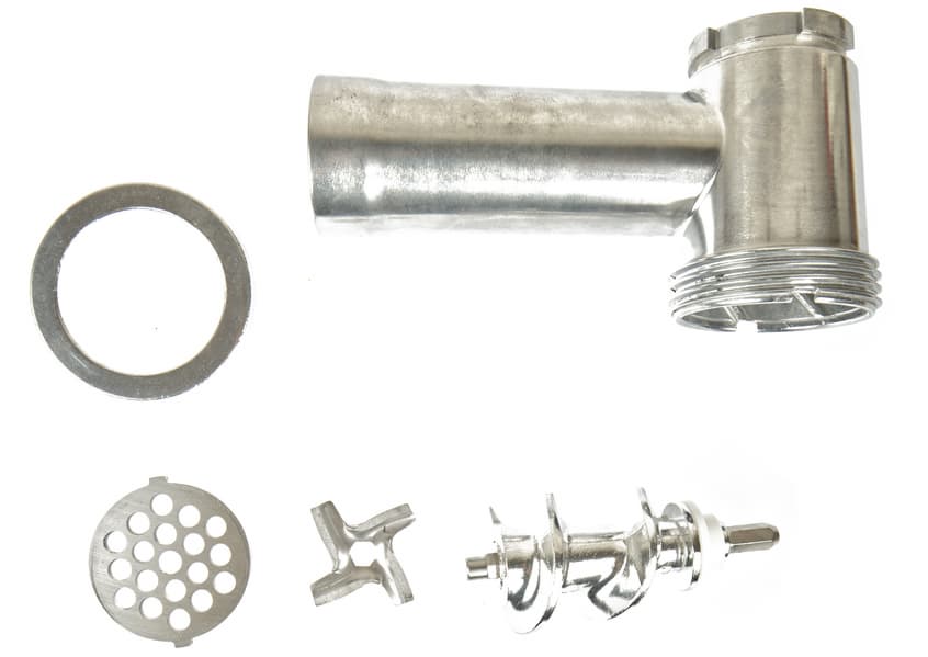 - мясорубка (загрузочный блок, кольцевая гайка, загрузочный лоток, толкатель, шнек, нож, решетки 3, 5 и 7 мм, насадки для колбас, кеббе, печенья, спагетти, макарон и тальятелле)