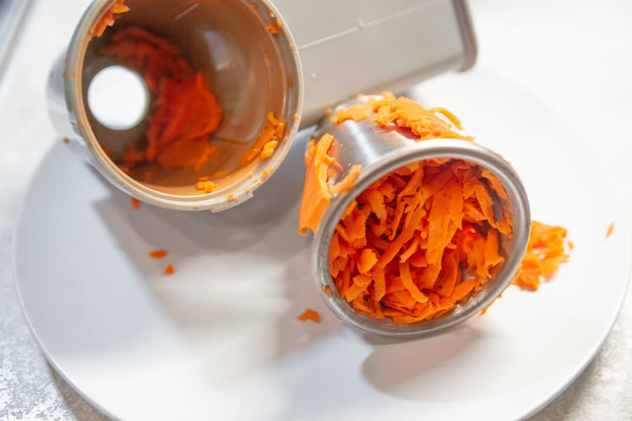Шинковка нарезает овощи очень тонкими пластинами, около миллиметра толщиной. Терка порадовала идеальной формой, вылетающей из нее морковной стружки, вот только дальность полета, удивила. Даже на 2-й скорости, миску приходилось держать на весу, по диагонали впритык к горловине терки, иначе морковь оказывалась где угодно, но только не в посуде.