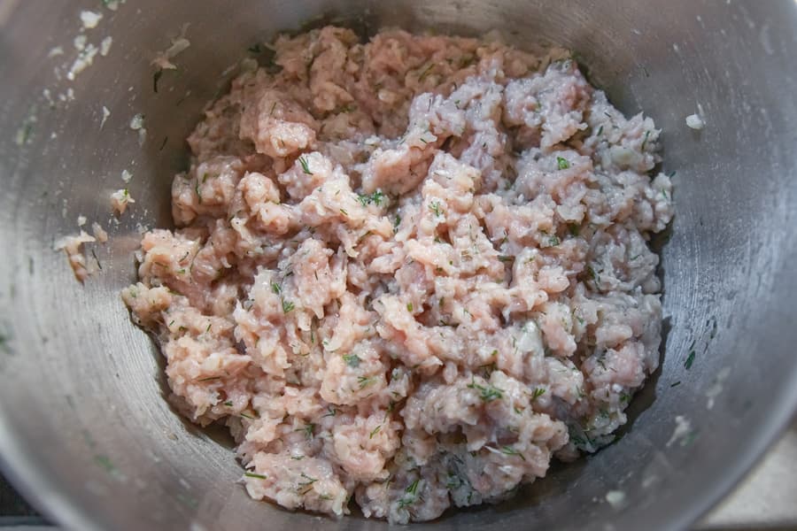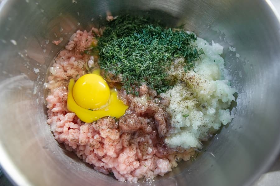 Пройдя мясорубку, к свиному фаршу отправилась крупная луковица. Затем черный молотый перец, соль, яйцо и измельченный укроп. Поставили насадку для смешивания и включили 3-ю скорость.