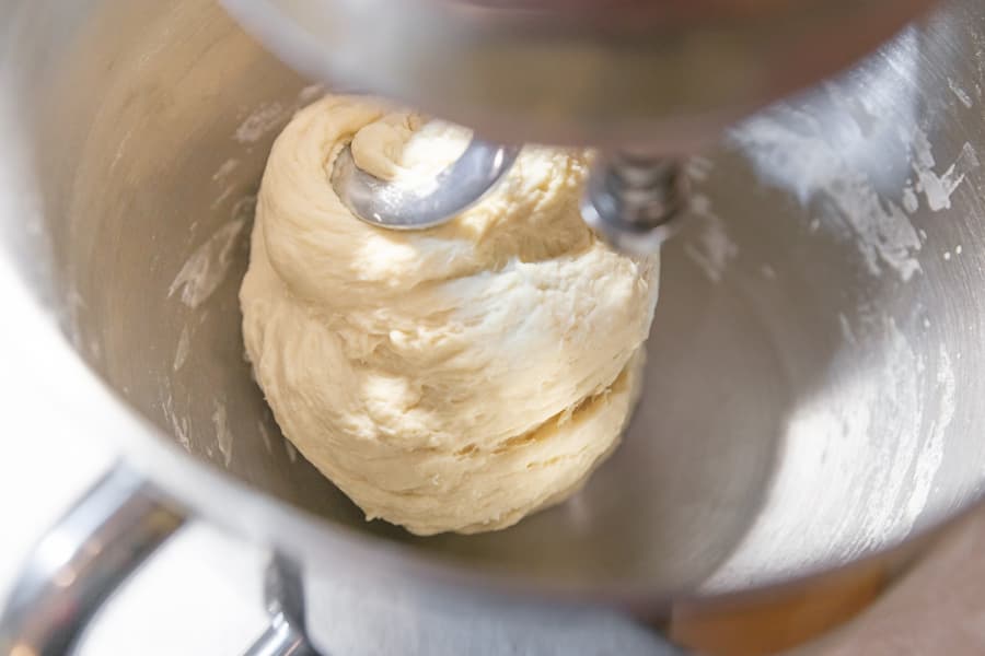 Уже на третьей минуте содержимое чаши становилось похожим на тесто, но два крюка разделяли его на части. Мы сняли меньший крюк и продолжили замес. Теперь тесто стало превращаться в однородный комок.
