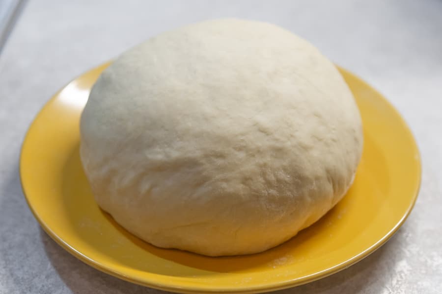 Мы сняли его с крюка, обмяли руками и, накрыв пищевой пленкой, оставили на некоторое время. С крюка тесто снялось с легкостью, к металлу и к рукам не прилипало. В результате у нас получился кусок плотного отлично замешанного пресного теста.