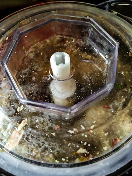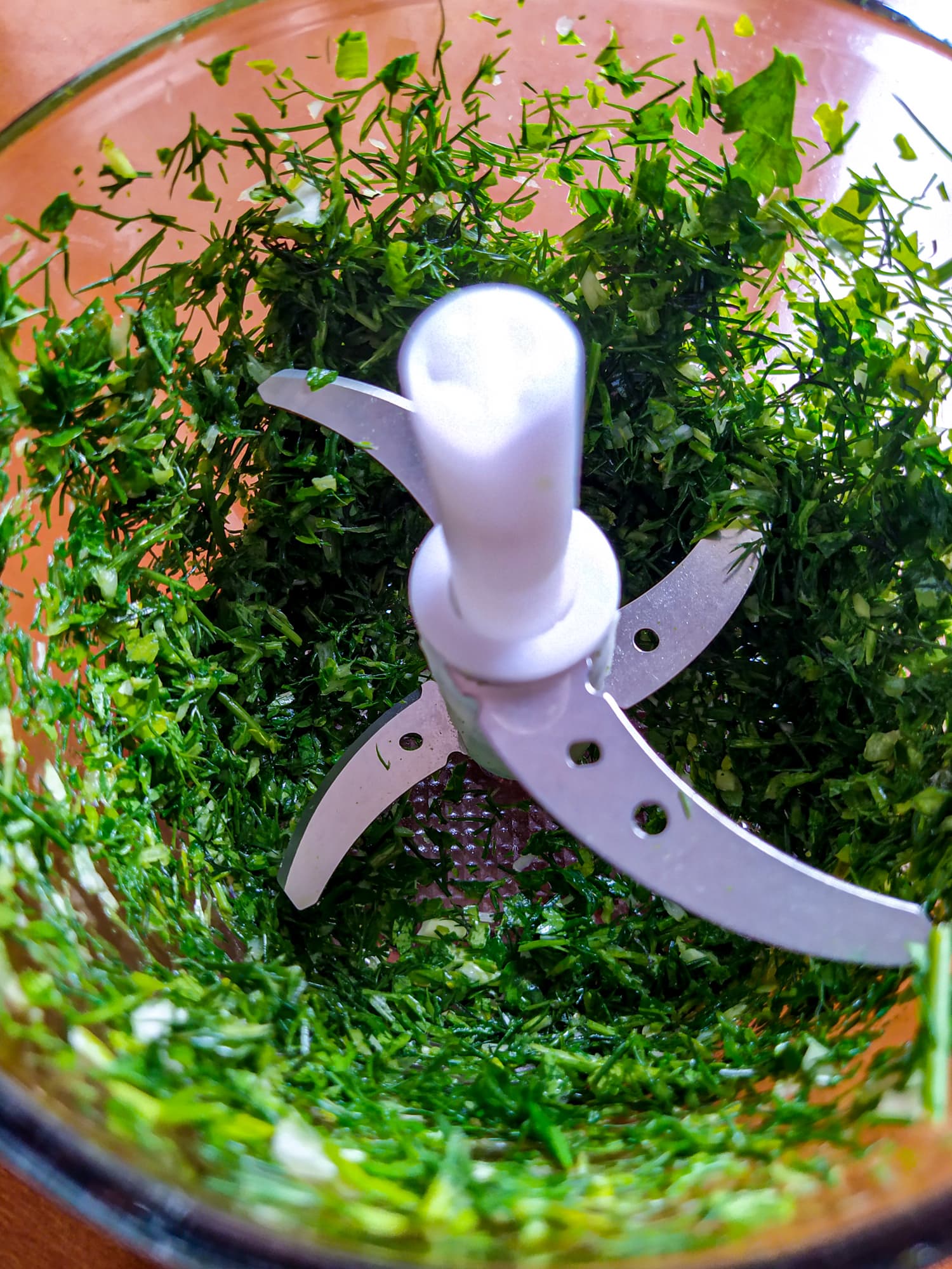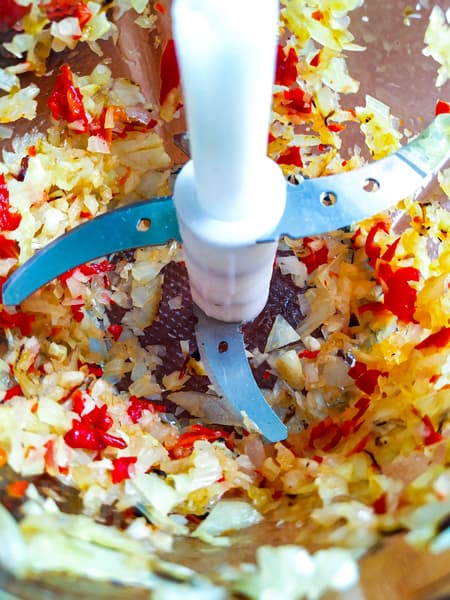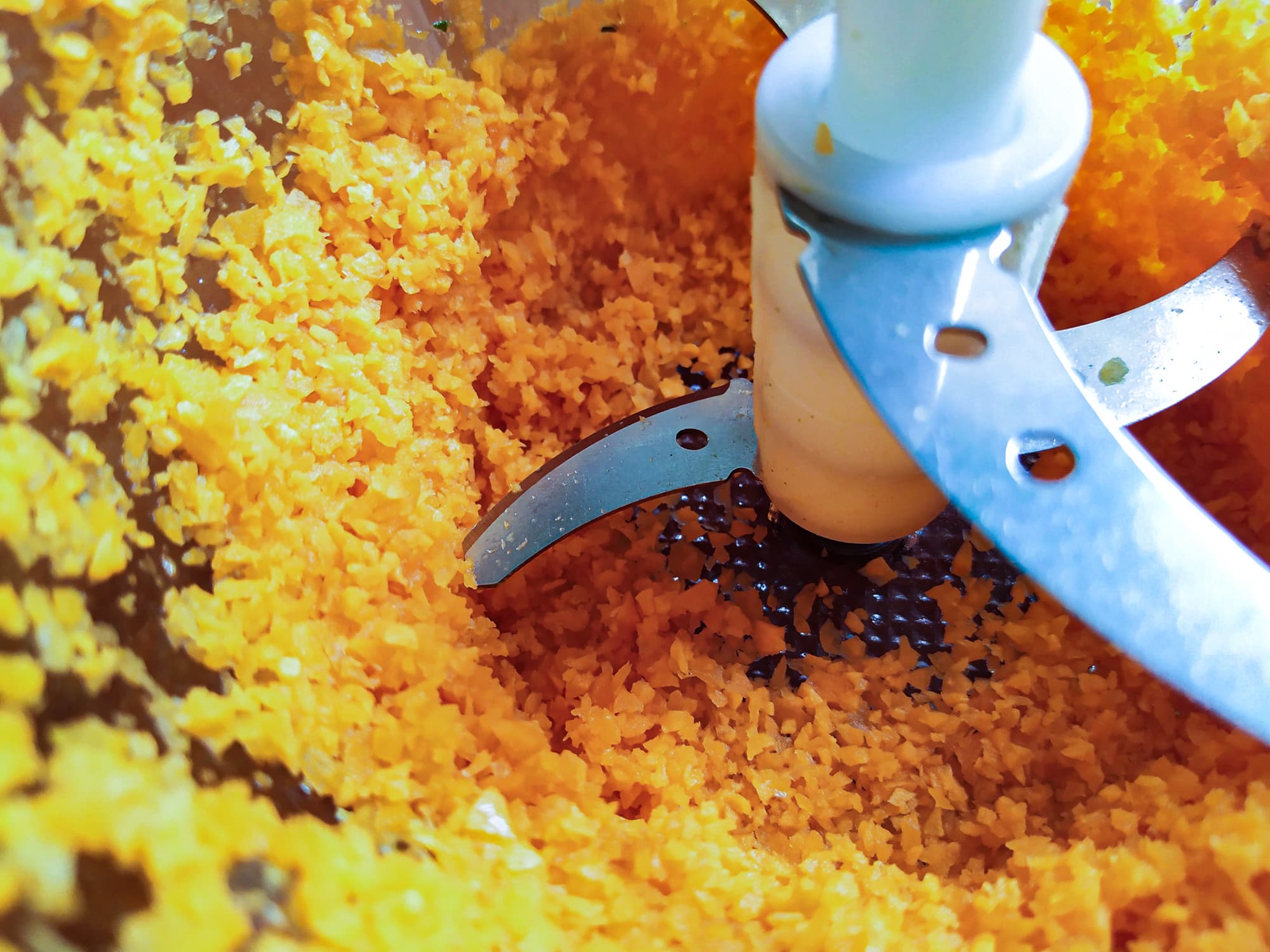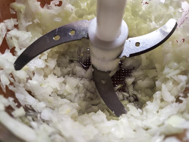 Начнем с лука. Две луковицы измельчали в общей сложности 10 секунд (пришлось один раз прерваться, чтобы сгрести поближе к ножам то, что осело на стенках чаши и на крышке.) Лук измельчен однородно, и даже у ножей нет кашицы, которая обычно появляется, пока ждешь, когда измельчатся верхние слои.