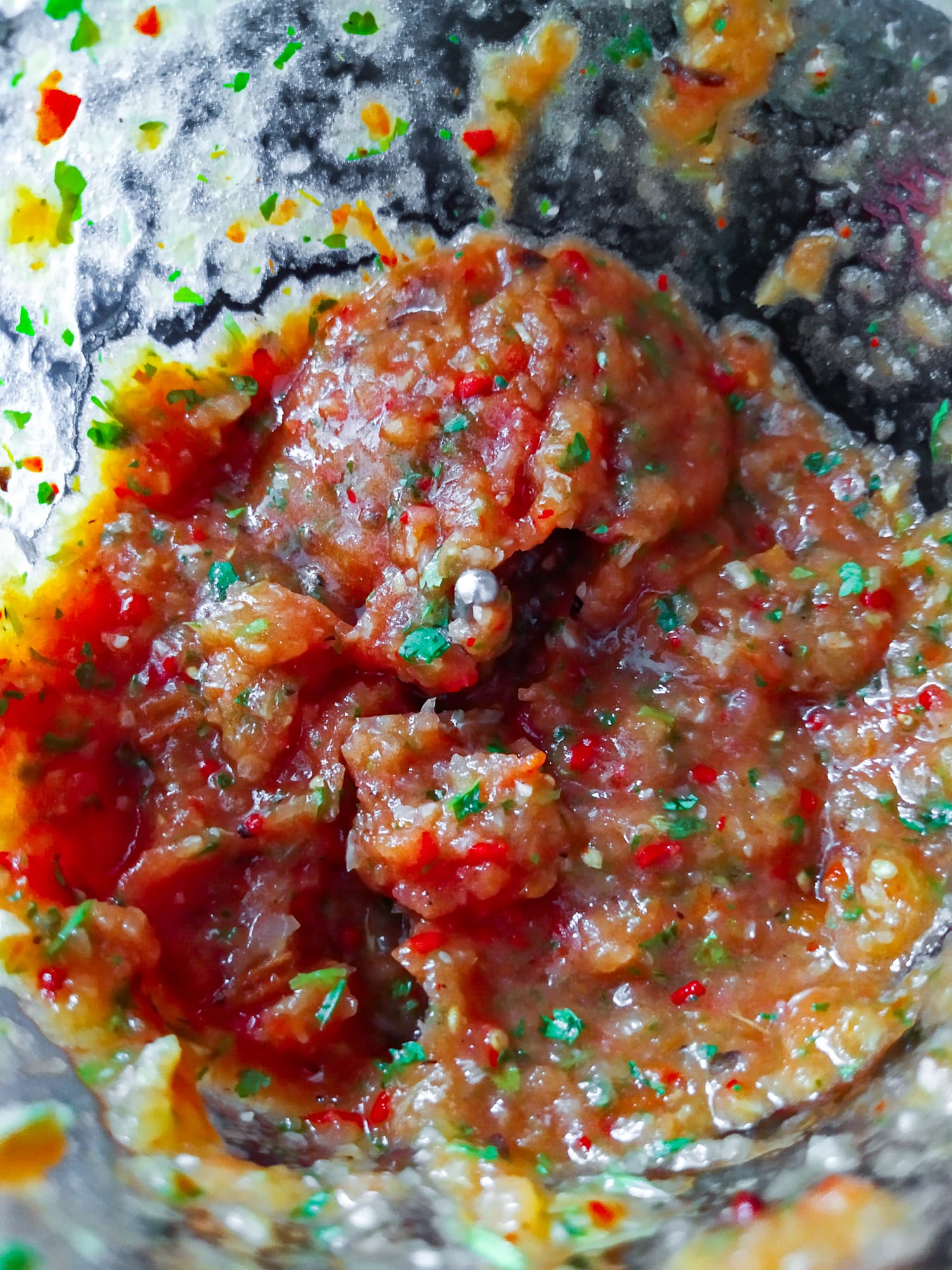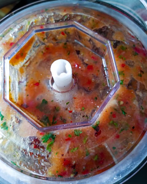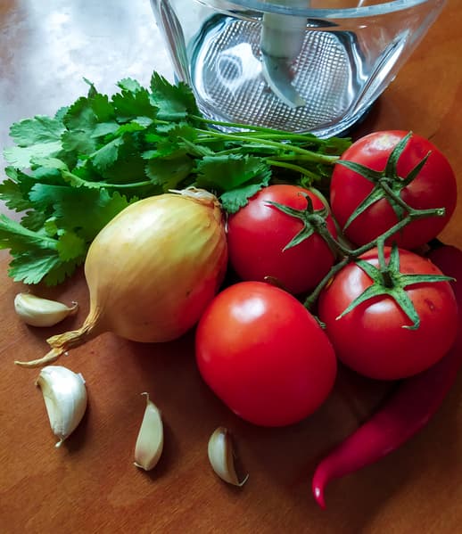 Затем добавили помидоры, соль, лаймовый сок и кинзу. Измельчали 10 секунд в импульсном режиме, чтобы соус не взбился до полной однородности — он, скорее, должен состоять из маленьких-маленьких кусочков.