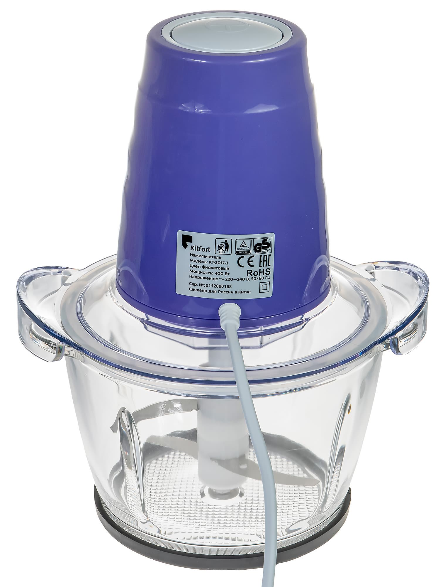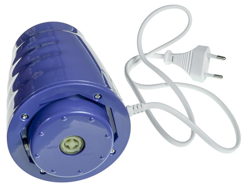 Рассмотрим детали KT-3017-1 поближе. Первый на очереди — моторный блок милого лавандового цвета. Он имеет форму усеченного конуса с ребристой поверхностью. Наверху — большая белая кнопка управления, внизу — пластиковый узел соединения с валом двигателя. Корпус легкий, хотя для измельчителя это не самая важная характеристика: держать деталь на весу вам не придется. А вот шнур коротковат, на наш взгляд, так что примоститься нужно будет совсем рядом с розеткой.