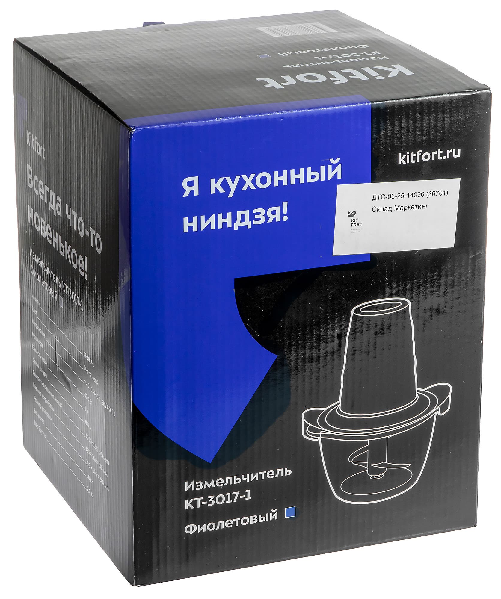 Небольшая коробка оформлена в фирменном стиле Kitfort: на черно-фиолетовом фоне векторное изображение прибора и название модели. На боковой грани — технические характеристики прибора.