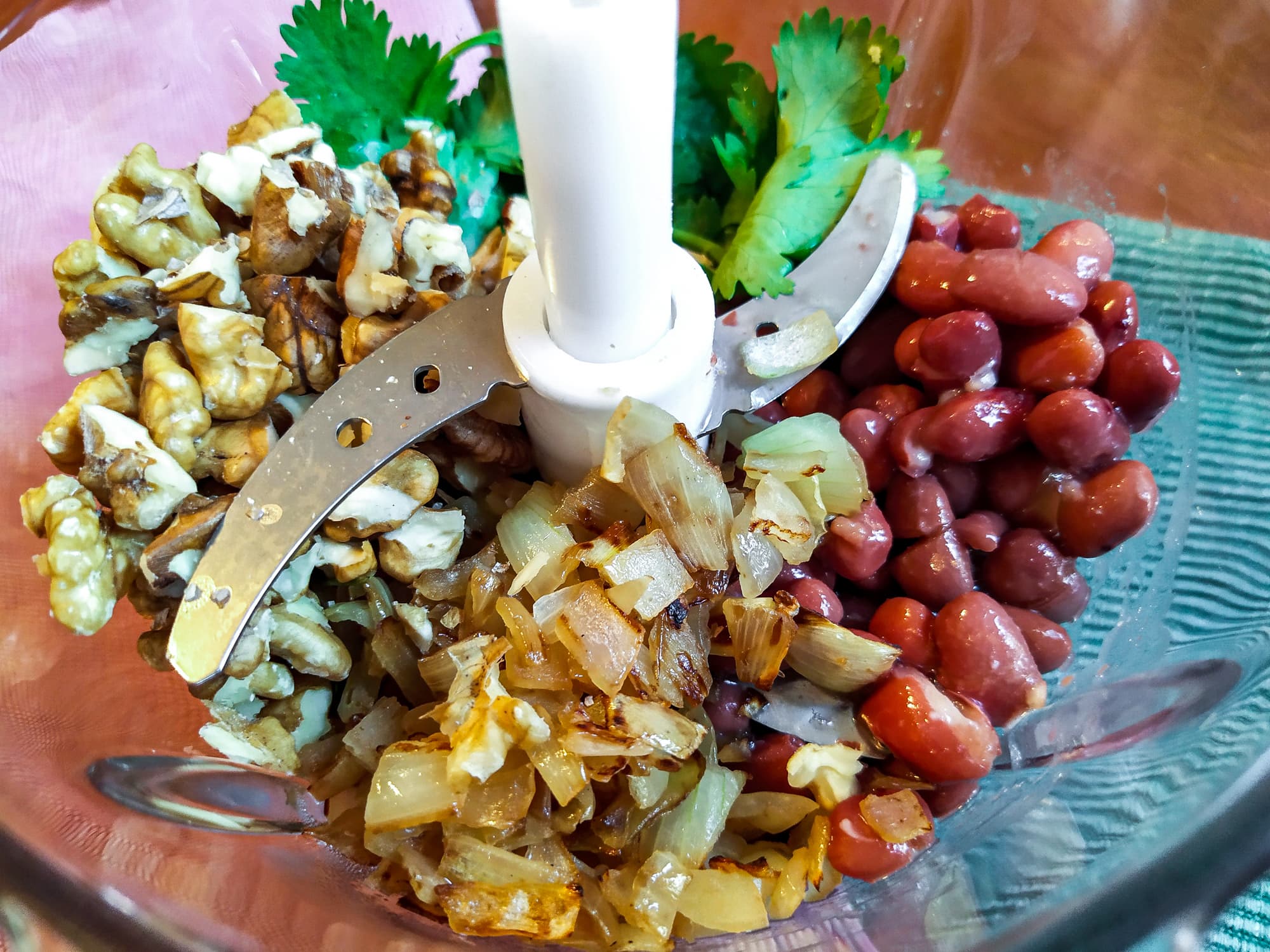 Консервированную красную фасоль, жареный лук, грецкие орехи и кинзу сложили в чашу, подлили к ним немного ароматного подсолнечного масла и включили измельчитель на 20 секунд.