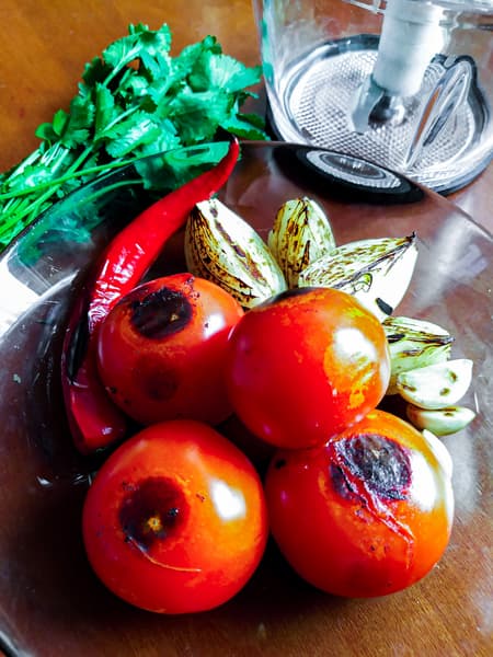 Овощи подпекли на сухой сковороде до появления подпалин. Первым делом в чашу отправились лук, чеснок и очищенный от семян острый перец.