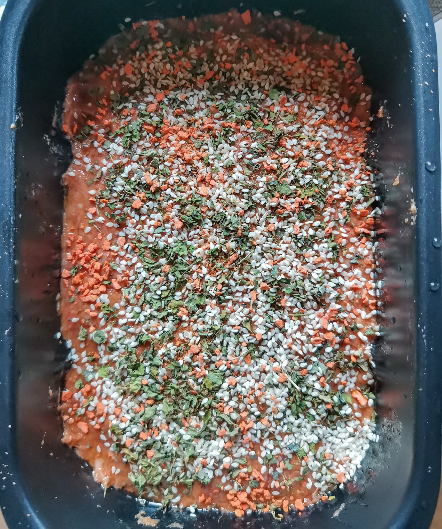 Сверху посыпали кунжутом, пажитником и сушеной морковью.