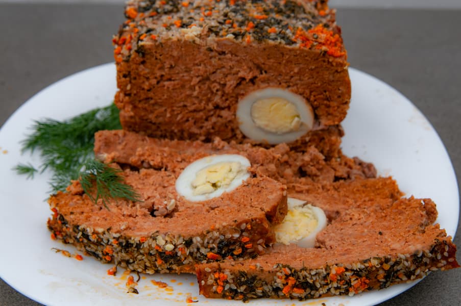Половину смеси уложили в емкость хлебопечки, туда же положили вареные яйца и накрыли их оставшейся смесью.