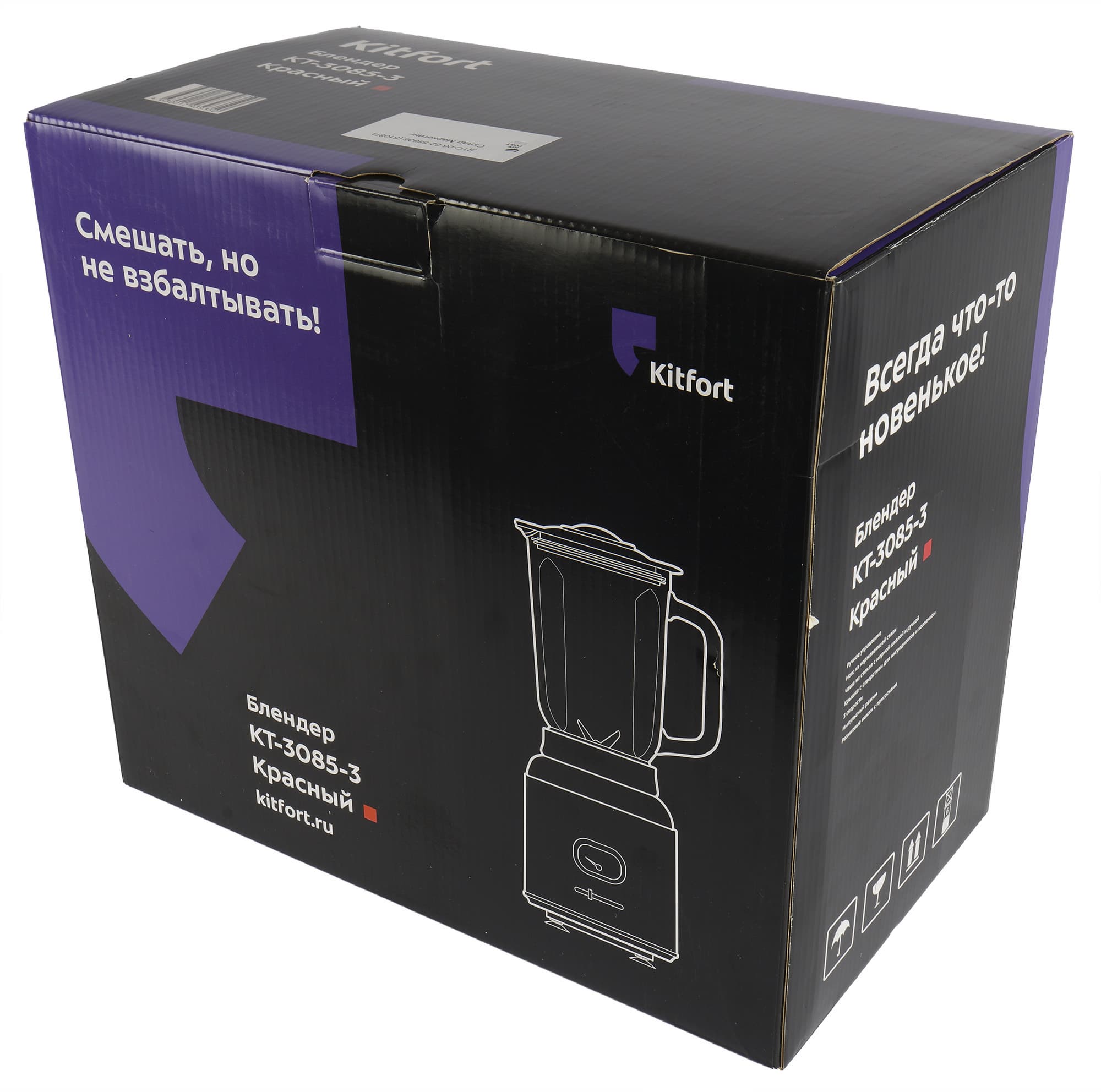 Блендер прибыл на тестирование в картонной коробке, оформленной в новой черно-фиолетовой гамме. На коробке присутствуют: схематичное изображение прибора, а также основные характеристики и техническая информация. В качестве защиты от ударов в процессе транспортировки внутри коробки блендер упакован в пенопластовые вставки. Коробка выглядит надежной, но ручками для переноски она не оснащена.