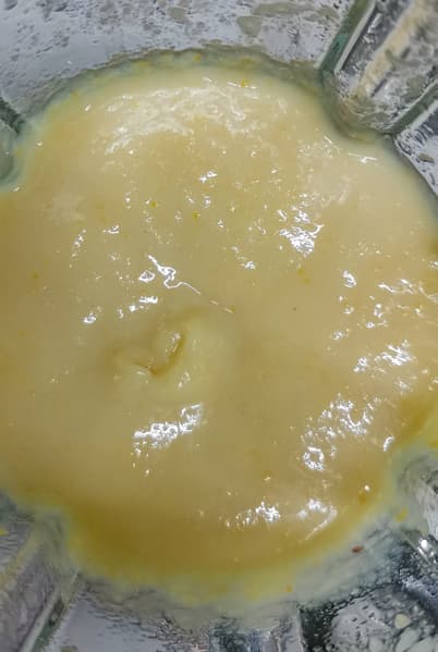 В блендер вылили лимонный сок, добавили сахар и немного лимонной кожуры. Выставили максимальную скорость, в процессе работы докидывали кусочки кожуры, доведя смесь до густого состояния. Блендер начал работать с некоторым усилием. Сделали перерыв в работе, чтобы дать мотору остыть, и через некоторое время включили блендер на максимальную скорость и измельчили лимоны до максимально гомогенного состояния.