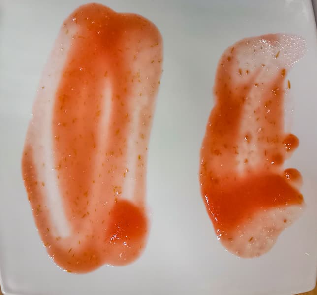 Через минуту сняли крышку, зачерпнули часть смеси для изучения. Семена оказались перемолоты не полностью, попадались целые. Кожица тоже была перемолота грубовато. Мы прокрутили смесь еще 1 минуту на максимальной скорости.