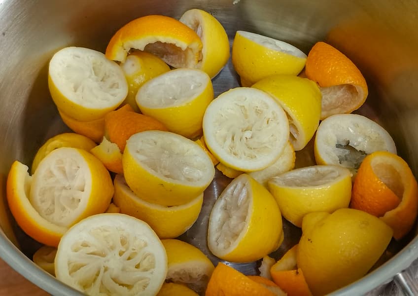 Для мармелада мы отжали сок лимонов, а лимонную кожуру с небольшим добавлением апельсиновой (для цвета), сварили в течение 20 минут со сменой воды.