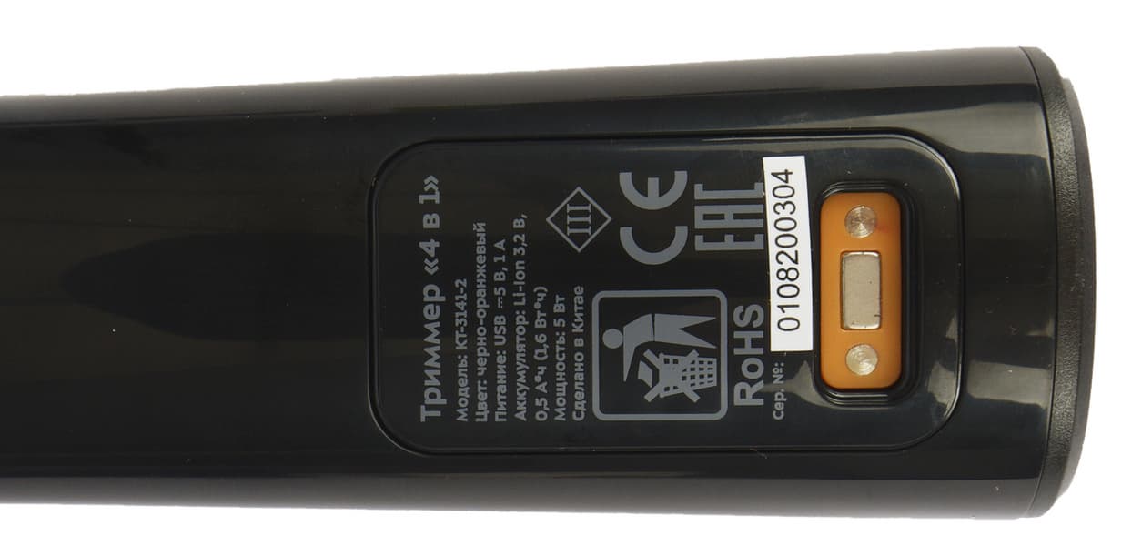 На триммере мы видим надпись Li-ion, свидетельствующую о том, что в триммере используется литий-ионный аккумулятор (емкостью 500 мА·ч).