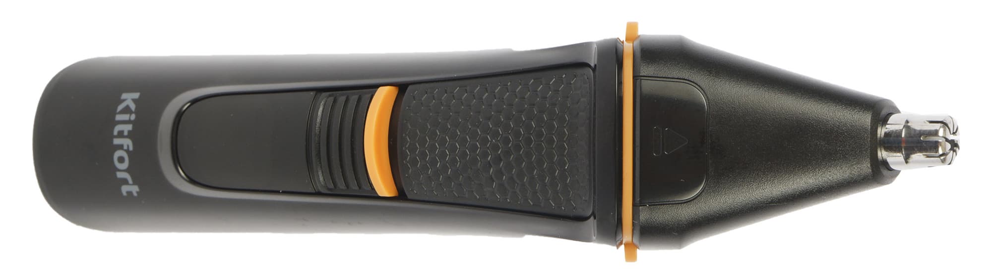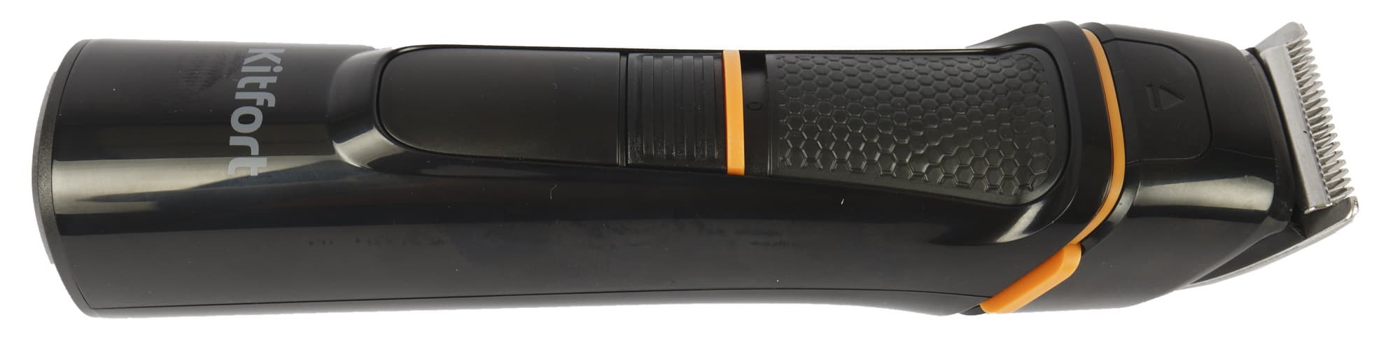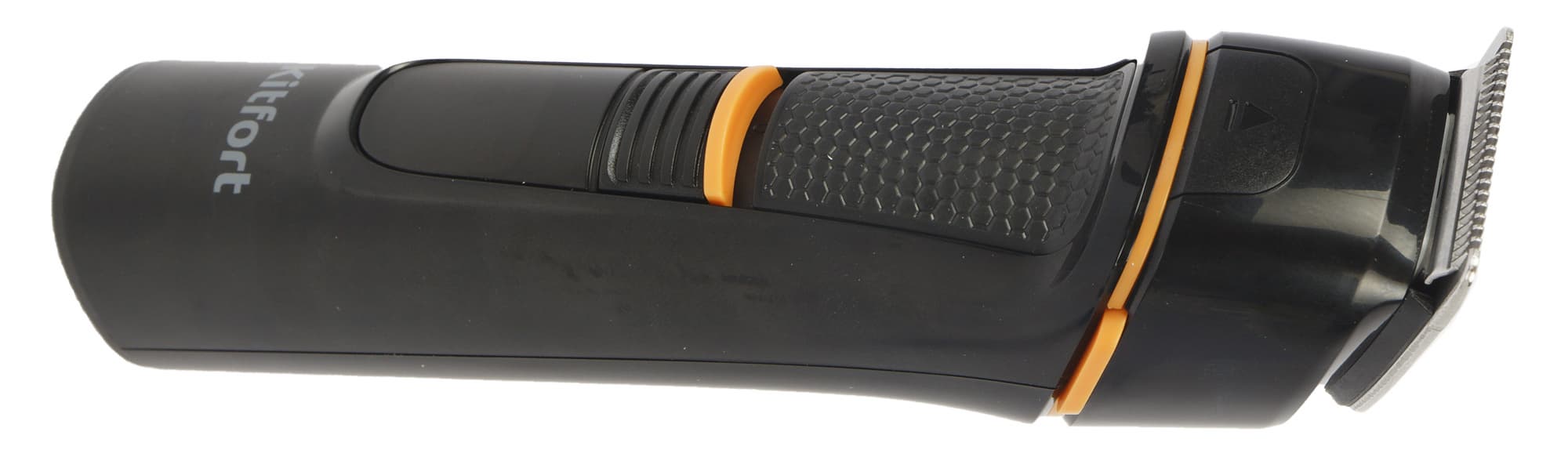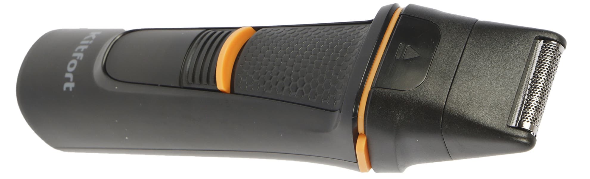 На лицевой стороне мы видим логотип Kitfort, над ним прячется светодиод, который загорается при подключении триммера к зарядному устройству. Выше выше расположена кнопка включения, а над ней — резиновая антискользящая зона захвата.