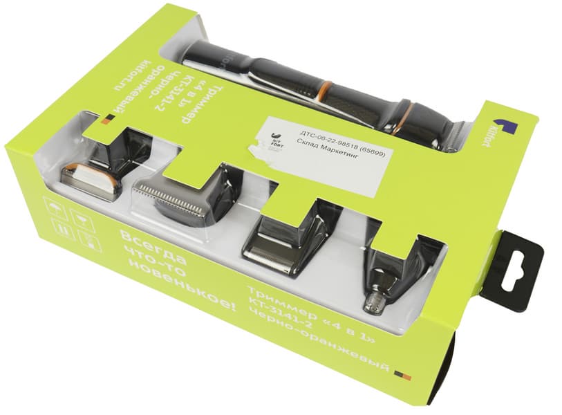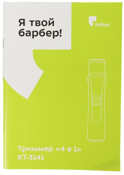 Триммер поставляется в небольшой картонной коробке, оформленной в фирменном стиле Kitfort. Фон у коробки зеленый. Сквозь прозрачную упаковку-блистер мы можем рассмотреть сам триммер и основные насадки (сменные гребни при этом прячутся внутри и не видны).